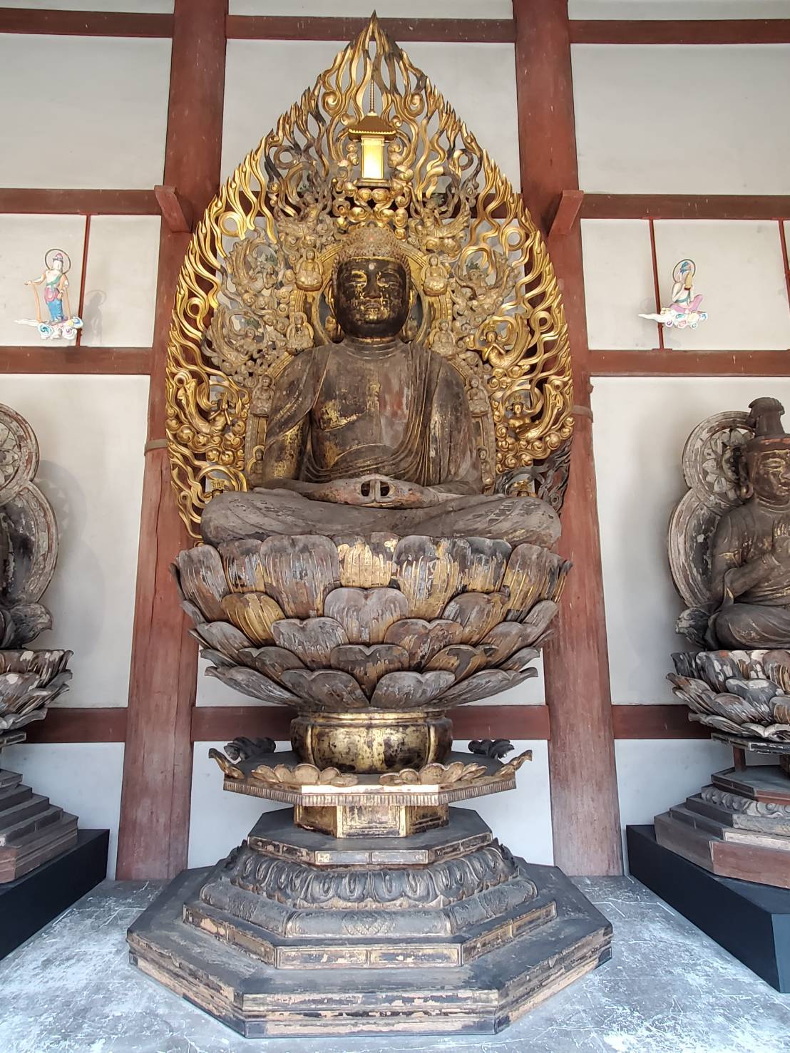 造立時期は定かではありませんが、大きな本堂にふさわしい威容をあらわします。また趺坐を組み、半跏にして足先をみせるのが特徴的です。穏やかな表情で、施無畏与願の印を組むお姿は、まさに極楽へと衆生を迎える来迎のありさまをあらわしてます。